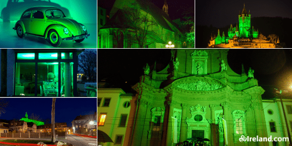 In Würzburg das Rathaus, das Neumünster sowie das Matthias-Grünewald-Gymnasium, in Rudolstadt das Residenzschloss Heidecksburg, in Cochem an der Mosel die Reichsburg, in Nürnberg die Kirche St. Klara, in Höchstadt an der Aisch die Karpfen Statue Fridolin, in Gescher das Mc Kiernan’s Irish Cafe, in Bad Kötzting der Pfingstreiter und das alte Rathaus. Zudem leuchtet in grün auch erstmals der erste in Irland gebaute VW Käfer, der in der Klassikersammlung der Autostadt in Wolfsburg steht.