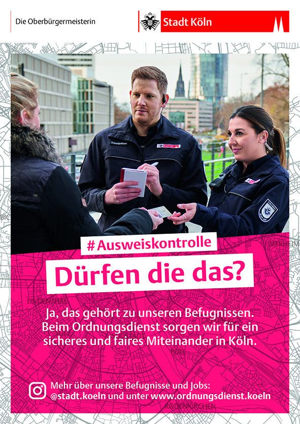 Ab heutigen Dienstag, 19. Januar 2021, hängt das Plakatmotiv der neuen Kampagne in den städtischen Informationsanlagen. Die Aussage ist deutlich: #Ausweiskontrollen in ordnungsrechtlichen Maßnahmen gehören zum Alltag des Ordnungsdienstes! Die Kampagne wird auch auf den städtischen Social-Media-Auftritten bei Instagram, Facebook und Twitter begleitet. Dort werden die beiden Protagonisten der Kampagne aus ihrem Einsatzgeschehen berichten. Sie schildern, was sie im Dienst erleben, welche Befugnisse sie haben und wieso diese für ihre Arbeit wichtig sind.