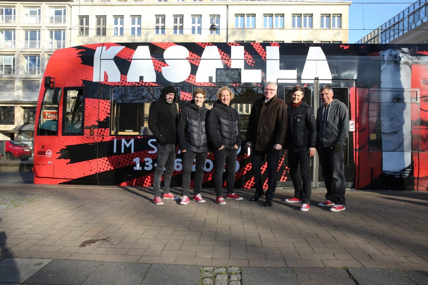 Der Totenkopf mit roter Pappnase fährt ab sofort auf Schienen quer durch die ganze Stadt. Denn der Energiedienstleister und Trinkwasserversorger RheinEnergie hat gemeinsam mit der Kölner Mundart-Band Kasalla eine Stadtbahn gestaltet. Diese kommt auf den Linien der Kölner Verkehrs-Betriebe (KVB) zum Einsatz. Die Bahn, die auf das große Konzert im RheinEnergieStadion am 13. Juni 2020 hinweist, zieren neben dem obligatorischen Totenkopf ein Kasalla-Schriftzug und die Konterfeis der Bandmitglieder.