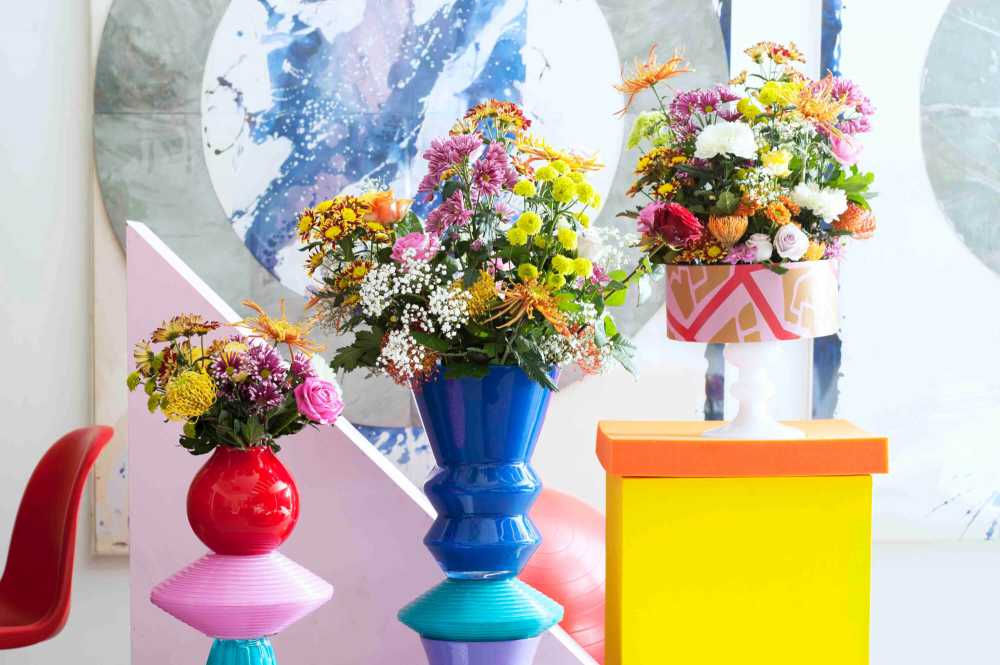 Auch die Blüten selbst weisen in Blattform, Blattanzahl und Größe eine beeindruckende Vielfalt auf. So sind die Santini-Chrysanthemen beispielsweise besonders kleinblütig und passen daher perfekt in natürliche Sträuße. Chrysanthemen in goldgelben, bronzeroten oder tieforangefarbenen Farbtönen erhalten Zuhause die Wärme des mittlerweile längst vergangenen Sommers. Die Farbpracht der buntgemischten sonnengelben Sträuße pulsiert regelrecht durch die vielen unterschiedlichen Chrysanthemen-Sorten. Optional können andere Blumen wie Rosen oder herbstlich dekorative Beeren dem Strauß beigemischt werden. Zudem unterstreichen bunte Vasen in geometrischen Formen die Farbpracht.