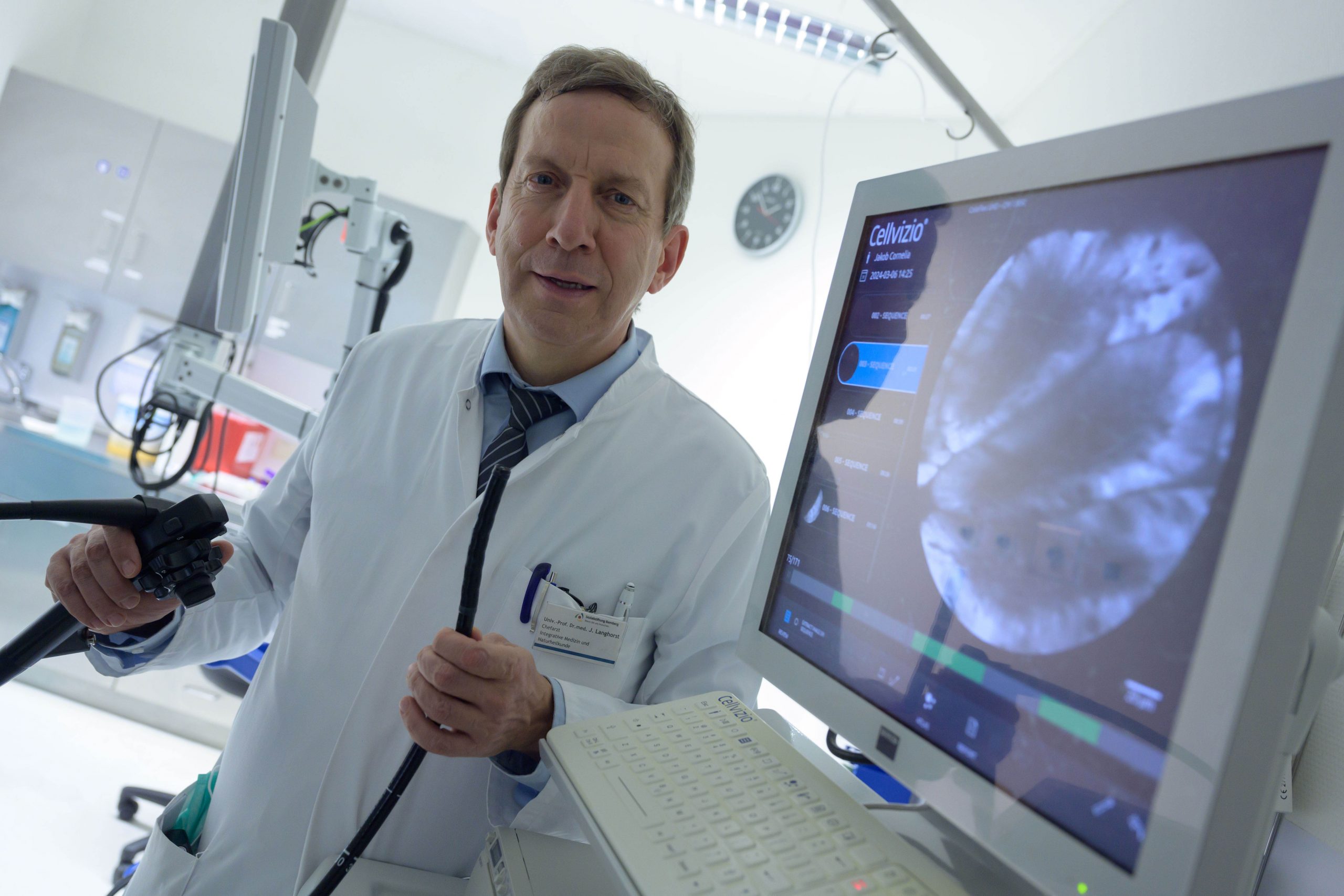 „Die konfokale Laserendomikroskopie (CLE) ist eine neue Untersuchungsmethode mit deren Hilfe wir die Darmbarriere in ihrer Funktion in Echtzeit beobachten und beurteilen können,“ erklärt der Gastroenterologe Professor Langhorst (58). „Beim gesunden Menschen sorgt dieser eng miteinander verbundene Zellverband dafür, dass Flüssigkeit und nützliche Nähr- und Mineralstoffe aus dem Verdauungstrakt in den Blutkreislauf gelangen können, während giftige Eiweißmoleküle und schädliche Mikroorganismen weiter im Darm verbleiben und Richtung Ausgang transportiert werden.“