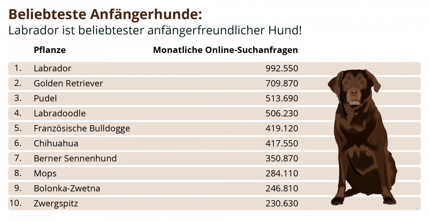 Mit 992.550 ist dieser aktive und freundliche Hund der klare Sieger der beliebtesten anfängerfreundlichen Hunderassen. Das gesellige Tier braucht Auslauf und Aufgaben, um sich artgerecht entwickeln zu können. Wer also über eine Anschaffung nachdenkt, sollte bereit sein, dem Beschäftigungstrieb dieses Hundes Rechnung zu tragen. Diese Rasse braucht viel Platz und Bewegung und sollte daher nur in einer entsprechenden Umgebung gehalten werden.