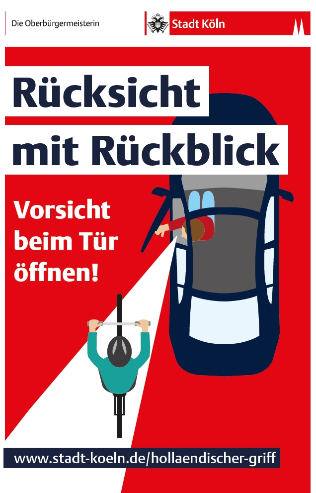 Mit einer am 30. März 2021 startenden Informations-Kampagne macht das Amt für Straßen und Verkehrsentwicklung auf das Thema „Dooring“ aufmerksam und mahnt stadtweit mit gleichnamigen Plakaten zur „Rücksicht mit Rückblick“. Weitere Informationen unter folgendem Link: https://www.stadt-koeln.de/leben-in-koeln/verkehr/verkehrssicherheit/der-hollaendische-griff-ruecksicht-mit-rueckblick