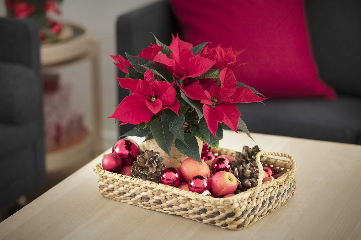 Noch einfacher zu gestalten ist diese bezaubernde Tischdekoration. Der klassisch rote Weihnachtsstern wird mitsamt Übertopf auf einem dekorativen Basttablett platziert. Rote Christbaumkugeln, Zieräpfel und Tannenzapfen runden das Arrangement ab. Weihnachtsstern-Tablett-Dekorationen lassen sich in jeder gewünschten Farbe und Stilrichtung arrangieren und so im Handumdrehen an den persönlichen Stil des zu Beschenkenden anpassen. Sie sind nicht nur langlebig und schön anzusehen, sondern auch sehr praktisch, denn sie lassen sich problemlos transportieren und mit einem einzigen Handgriff beiseite räumen, wenn der Platz auf dem Tisch oder der Kommode einmal anderweitig benötigt wird.
