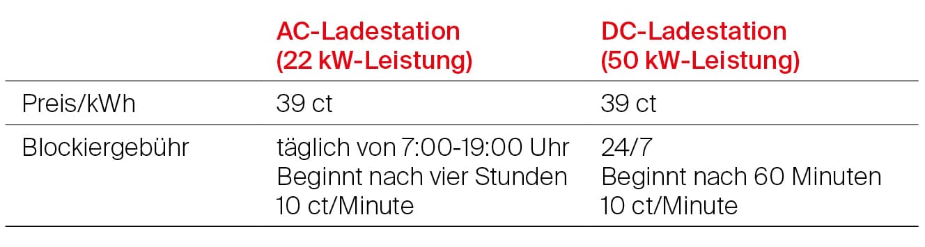 Bei Schnellladesäulen mit DC-Standard (steht für Direct Current/Gleichstrom) und einer Ladeleistung von 50 kW fällt die Gebühr rund um die Uhr nach einer Stunde Ladezeit an. Der jeweilige Startzeitpunkt für die Gebühr orientiert sich an der durchschnittlichen Ladedauer eines E-Autos. Diese variiert je nach Fahrzeugmodell, verbauter Ladesteuerung und individueller Einstellung durch die Fahrerinnen und Fahrer.