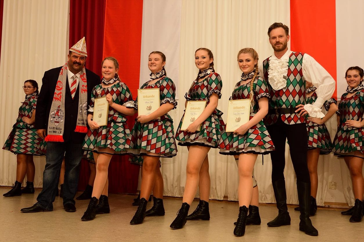 Bei der „großen“ Tanzgruppe wurden anlässlich des 11-jährigen Jubiläum der Harlequins erstmals Ehrennadeln für langjährige aktive Teilnahme durch die Tanzgruppenleitung und den Vorstand der K.G. verliehen. Die bronzene Ehrennadel für fünf aktive Jahre gingen an Franziska Hofmann, Maike Maiwald, Sabrina Pannes, Jasmin Woock und André Bussmann. Die silberne Ehrennadel für acht aktive Jahre erhielten Juliane Renn, Tobias Fund und Kai Maiwald.