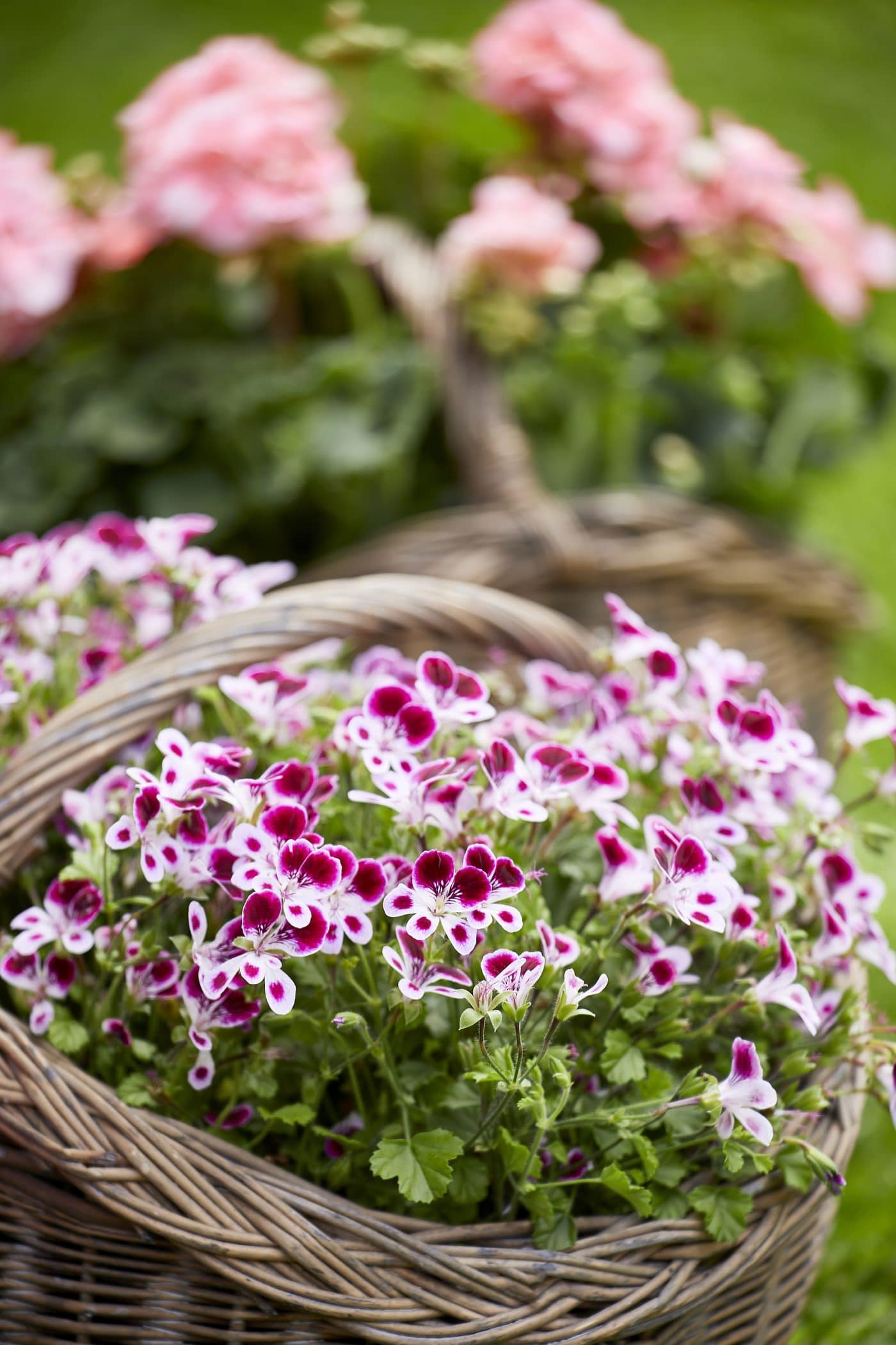 Ein mit Geranien gefüllter Korb ist ein toller Blickfang und eine schöne Geschenkidee zum Muttertag. Wenn man Duftgeranien wählt, spricht das blühende Geschenk die Sinne nicht nur mit schönen Blüten, sondern zusätzlich mit einem angenehmen Aroma an. Wie alle Geranienarten bevorzugen Duftgeranien einen sonnigen bis halbschattigen, warmen Standort und freuen sich über regelmäßige Wasser- und Düngergaben.