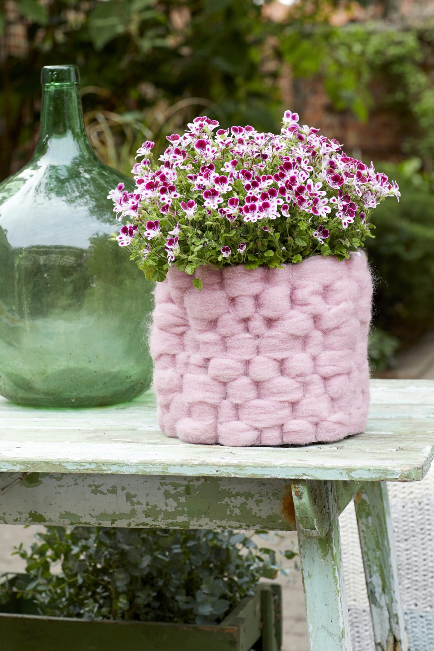 Selbst gemachte Geschenke sind besonders persönlich und enthalten eine Extraportion Liebe und Aufmerksamkeit. Bei diesem hübschen DIY-Geschenk verwandelt Filzwolle einen schlichten Übertopf in ein echtes Schmuckstück. Wer das Wolltopf-Arrangement selbst gestalten möchte, benötigt neben geschickten Fingern eine üppig blühende Duftgeranie im Übertopf, Filzwolle und grobmaschiges Drahtgewebe.