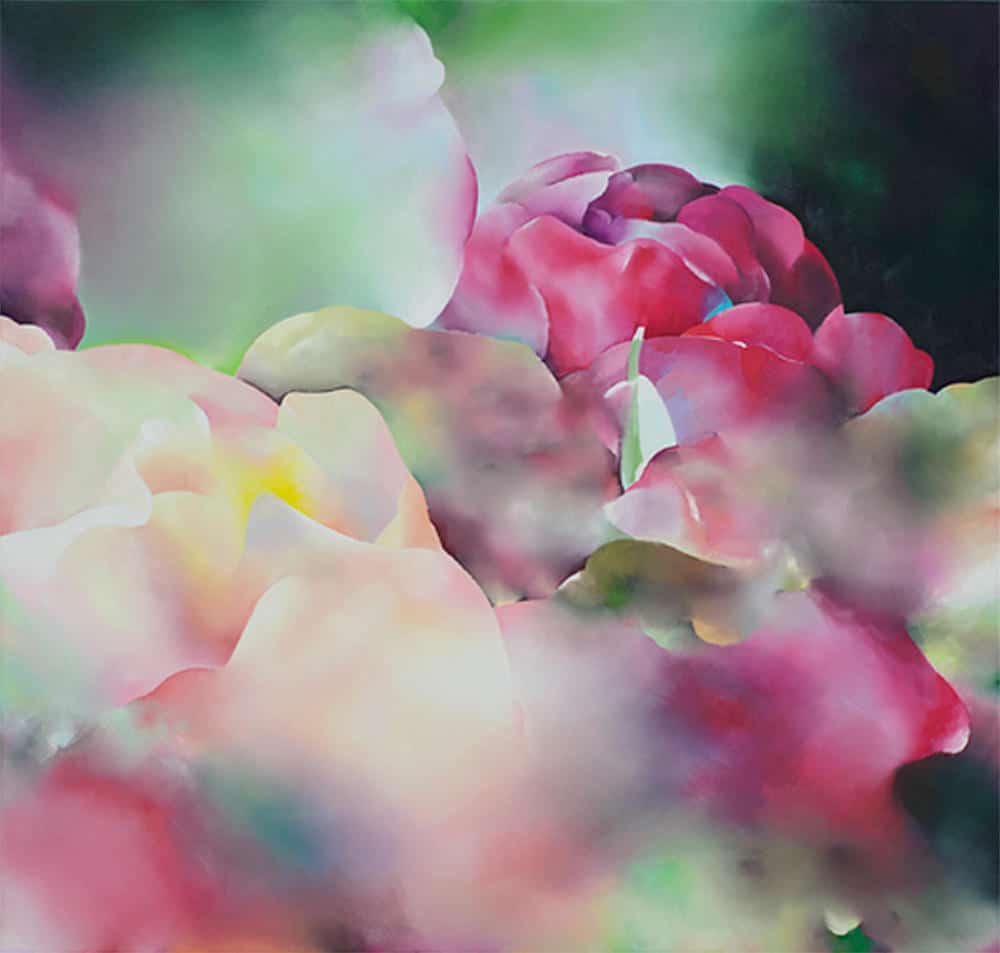 Da diffundieren Rosen, Papageientulpen und Magnolien in Rhea Standkes Gemälden zu ekstatischen, virtuos abstrahierten Farb- und Lichtlandschaften; womit die gebürtige Dresdenerin gleichsam einen gänzlich entmaterialisierten Bildkosmos erschafft. Alex Krull veranschaulicht uns in ihren hypnotischen Wasser- und Schwimmbadansichten die Vergänglichkeit und Nicht-Wiederholbarkeit des Moments – der sich aus einem hochästhetischen Kompendium aus Wellen, Spiegelungen und architektonischen Elementen speist.