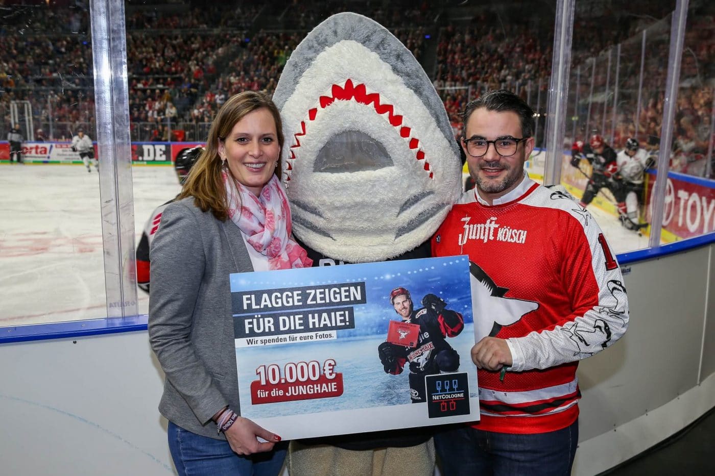 Zum Start der Play-Off Runde waren die Fans der Kölner Haie zum Mitmachen aufgefordert: Unter dem Motto „Flagge zeigen für die Junghaie“ konnten sich alle Haie-Fans beim ersten Heim-Play-Off-Spiel live oder auch Zuhause mit einer Fahne fotografieren. Für jedes eingereichte Foto spendet NetCologne 5 Euro. Beim Duell gegen die Ice Tigers aus Nürnberg erhielten die Junghaie jetzt den Spendencheck über 10.000 Euro. Egal, ob Selfie, Gruppenfoto mit der Haie-Fahne oder jüngster Fan – jedes Foto zählte bei der Fan-Aktion von NetCologne. Die Teilnehmer konnten damit nicht nur ihren Verein unterstützen, unter allen Einsendungen wurde eine Trainingseinheit mit Pascal Zerressen und ein Samsung Galaxy S8 verlost. Der Gewinner ist auf den Facebook-Seiten von NetCologne und den Kölner Haien bekannt gegeben.