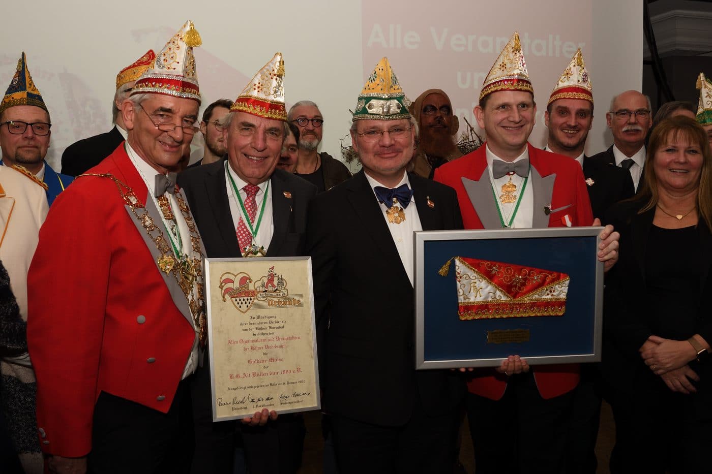 Über 40 Veranstalter und Organisatoren waren dann auf der Bühne dabei, als Wilhelm Stoffels, der Leiter der Schull- und Veedelszöch stellvertretend die gerahmte „Goldene Mütze“ samt Urkunde überreicht bekam. Die Laudatio hielt mit Alt-OB Jürgen Roters der Goldene-Mützen-Träger des Vorjahres. In bewegenden Worten hob er besonders das wichtige ehrenamtliche Engagement in den vielen Vereinen hervor und betonte, dass ohne dieses der Karneval nicht das wäre, was er heute ist. Karneval sind eben nicht nur die großen Gesellschaften und Garden oder der Rosenmontagszug, sondern vor allem die Aktivitäten vor Ort in den vielen Kölner Veedeln. Wilhelm Stoffels nahm die Ehrung dankend an und betonte, dass er diese sehr gerne stellvertretend für die unzähligen Aktiven vor Ort annehme. Auch er unterstrich, wie wichtig das Ehrenamt für den Karneval sei und dass diese Ehrung gerade für die vielen oft nicht so bekannten Aktiven eine ganz besondere Auszeichnung darstelle. Alle Organisatoren und Veranstalter erhielten eine persönliche Urkunde und die neu geschaffene Ehrennadel der „Goldenen Mütze“. Passend dazu gab es stehende Ovationen und alle sangen und schunkelten mit, als „En unserem Veedel“ der Bläck Fööss angestimmt wurde.