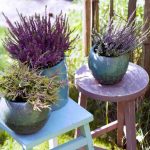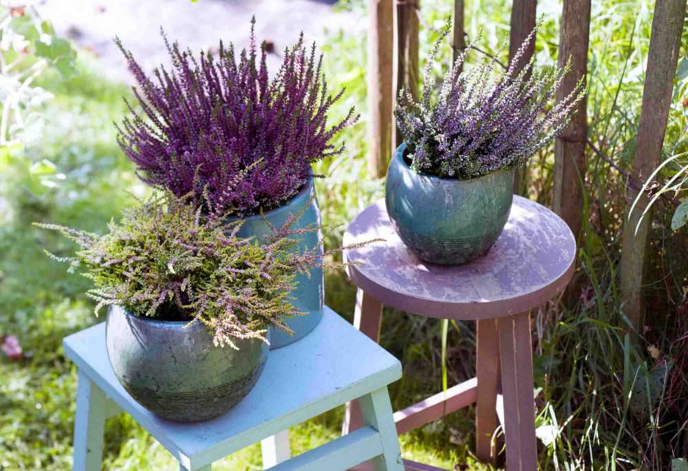 Die Besenheide eignet sich mit ihren kleinen Blüten in Violett oder Rosa ideal für eine rustikale Gestaltung. Die abstehenden Zweige verleihen dem Garten ein Flair von unberührter Wildnis. Um den natürlichen Charakter zu unterstreichen, wird das Heidepflanzengewächs am besten in Keramiktöpfen in Farbtönen wie Grün oder Grau gepflanzt. Gartenmöbel aus unbehandeltem Holz dienen als Podest für den immergrünen Zierstrauch.