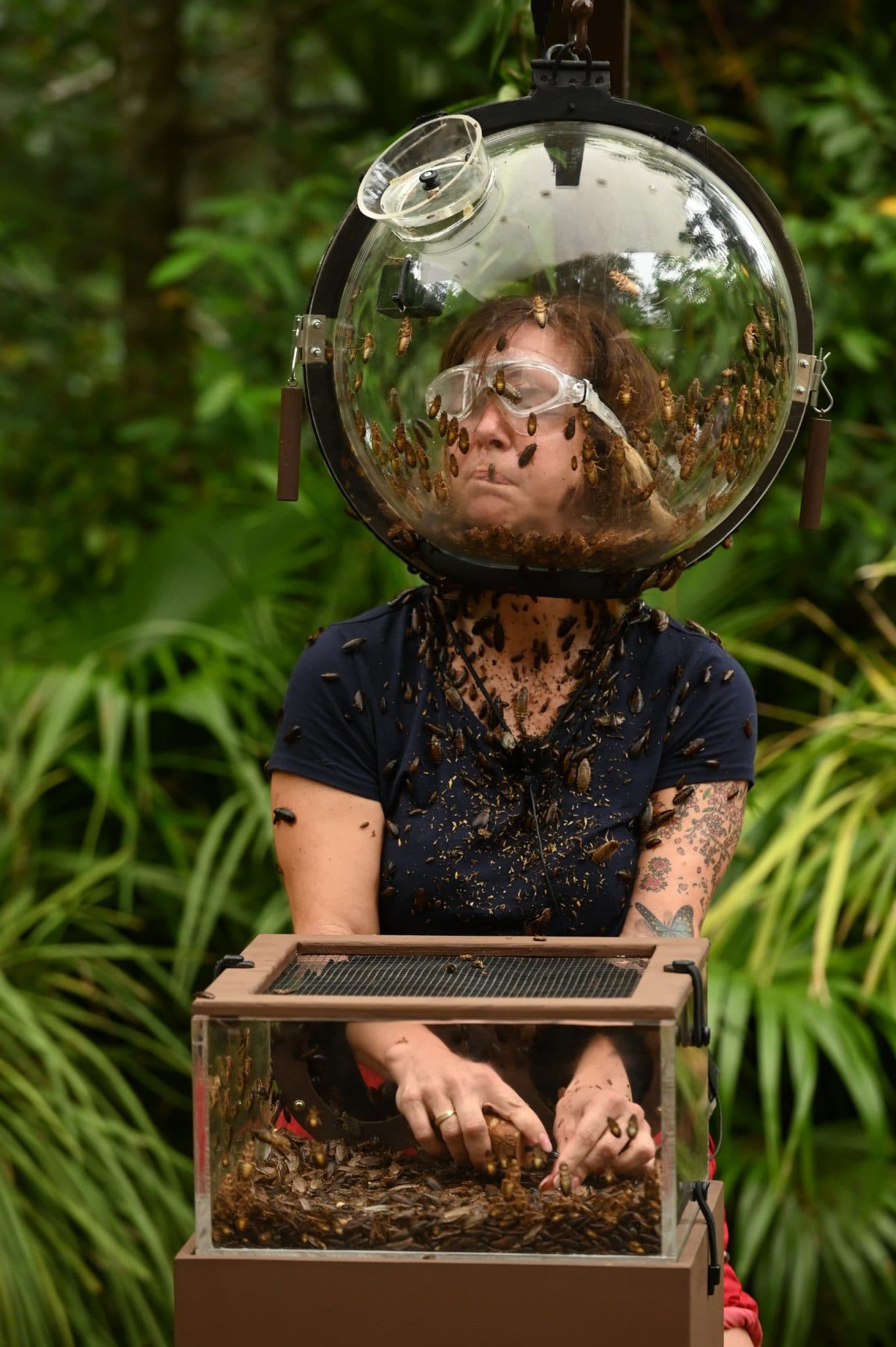 Die Prüfung startet: Danni Büchner steckt ihren Kopf in einen Glashelm, ihre beiden Hände in eine Glasbox. Beide Glasbehälter werden mit Kakerlaken gefüllt. Zumindest ein Stern hat sie so erkämpft. So gibt es zum Abendessen nur eine Portion der Vorspeise für die drei Finalisten.