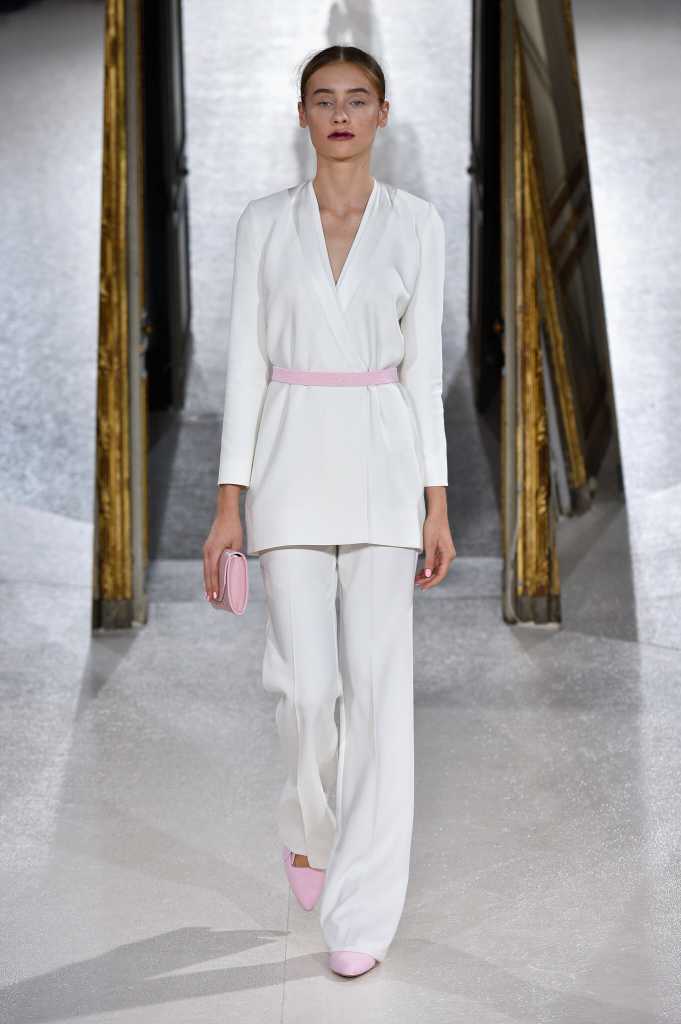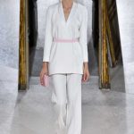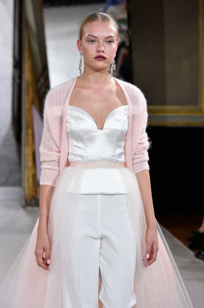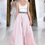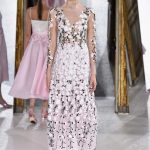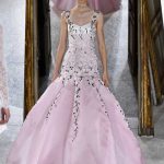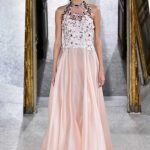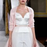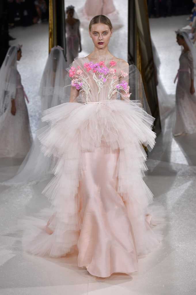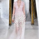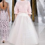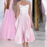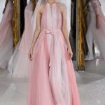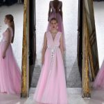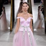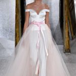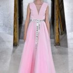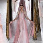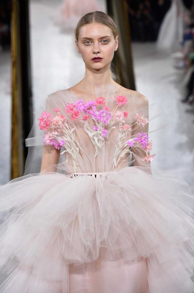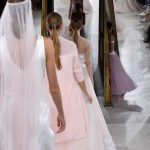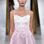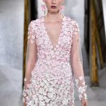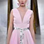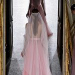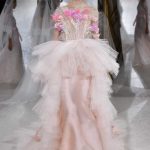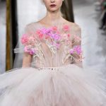 Neu ist neben der Farbe, dass zusätzlich zu den bereits bekannten, opulenten Tüllen-Silhouetten sehr körpernahe, lange, schmale Looks das Portfolio ergänzen und durch ein raffiniertes Schnitt-Design eine neue Signatur- Silhouette erschaffen. Diese ist ab der unteren Hüfte wie ein Blütenkelch geschnitten und wird in der Kollektion als Calice-Design (französisch: Blütenkelch) in dreifacher Ausführungen präsentiert. Das Spiel mit Kontrasten vollzieht Kaviar Gauche eher subtil durch die heterogene Kombination von Materialien – so trifft filigraner Seidentüll auf rosa Strick. Aber auch maskuline Hosen- und Blazerlooks werden integriert und zeigen den Facettenreichtum der Kollektion auf. Das Highlights der Präsentation ist das ‚LA VIE EN ROSE DRESS‘, welches durch unzählige, in Handarbeit aufgestickte Blüten besticht und die Trägerin in Blumen hüllt. Hervorzuheben ist das Bouquet-Dress, das aus hundert Meter zuckerwattefarbenen Tüll gefertigt und im Oberteil mit Seidenblumen appliziert wurde. Kombiniert wird dieses Couture-Dress mit einem Band, das die Aufschrift ‚From Kaviar Gauche with Love‘ trägt und die Message des Labels auf den Punkt bringt.