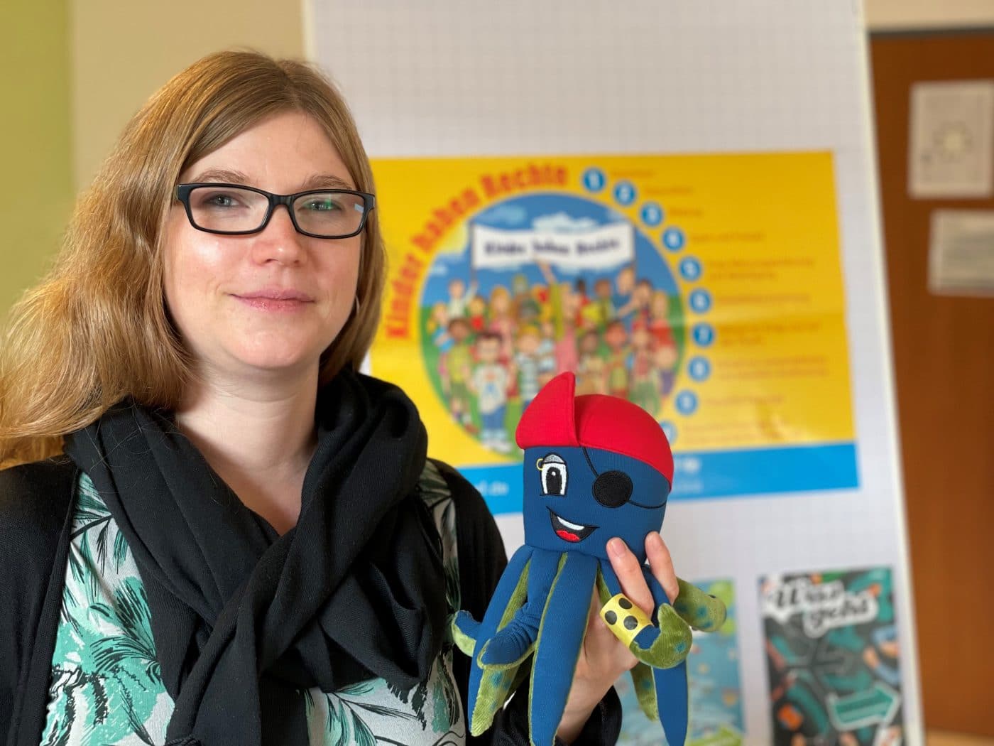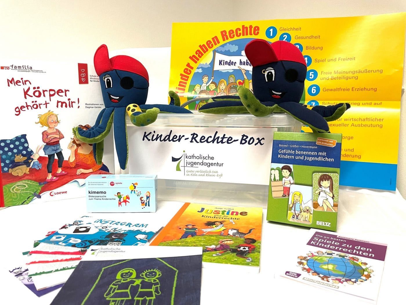 „Kinder haben Rechte und das 365 Tage im Jahr“, sagt Theresa Heckenbücker und ergänzt: „Das ist aber nicht jedem jungen Menschen klar“, so die Präventions-beauftragte der KJA Köln. Zusammen mit ihrem pädagogischen Team hat sie eine „Kinderrechte-Box“ entwickelt, die nun pünktlich zum internationalen Tag der Kinderrechte (20.11.) allen Einrichtungen zur Verfügung steht. Neben alters-gerechten Büchern, Spielideen und Malvorlagen sticht eine eigens für diese Box entwickelte Stoffkrake heraus. „Diese Krake hat 10 Beine. Jedes Bein steht für ein Kinderrecht. So kann spielerisch mit den Kindern jedes ihrer Rechte thematisiert werden“, ist sich Heckenbücker sicher. Darüber hinaus laden Gefühlskarten dazu ein, mit Kindern den sensiblen Bereich „sexualisierte Gewalt“ thematisieren zu können.