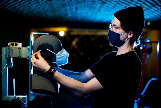 „Bisher wurden die akustischen Auswirkungen von Mund-Nase-Bedeckungen nur in wenigen Studien thematisiert“, sagt Prof. Dr. Christoph Pörschmann vom Institut für Nachrichtentechnik der TH Köln. „Um den Einfluss von Gesichtsmasken auf die Sprachverständlichkeit weiter zu untersuchen, haben wir die Schallabstrahlung, also Dämpfung und Richtwirkung des Schalls, von sechs verschiedenen Modellen gemessen.“ Untersucht wurden ein Mikrofaserschal, eine einfache Stoffmaske und eine so genannte Community-Maske, also eine selbstgenähte Mund-Nase-Bedeckung, mit mehreren Schichten sowie eine medizinische Einwegmaske, eine KN95-Maske und eine FFP2-Maske. Mithilfe eines motorgesteuerten Messsystems hat das Team des Instituts die Schallabstrahlung eines Kunstkopfes mit Mundsimulator gemessen und den für die menschliche Stimme relevanten Bereich von 100 Hertz bis acht Kilohertz untersucht. „Der Kunstkopf lässt sich um zwei Achsen drehen, so dass wir die Schallabstrahlung für alle erdenklichen Kopforientierungen messen konnten“, sagt der wissenschaftliche Mitarbeiter Tim Lübeck. Diese Messung wurde einmal ohne Maske und anschließend für jedes Modell insgesamt zweimal durchgeführt.