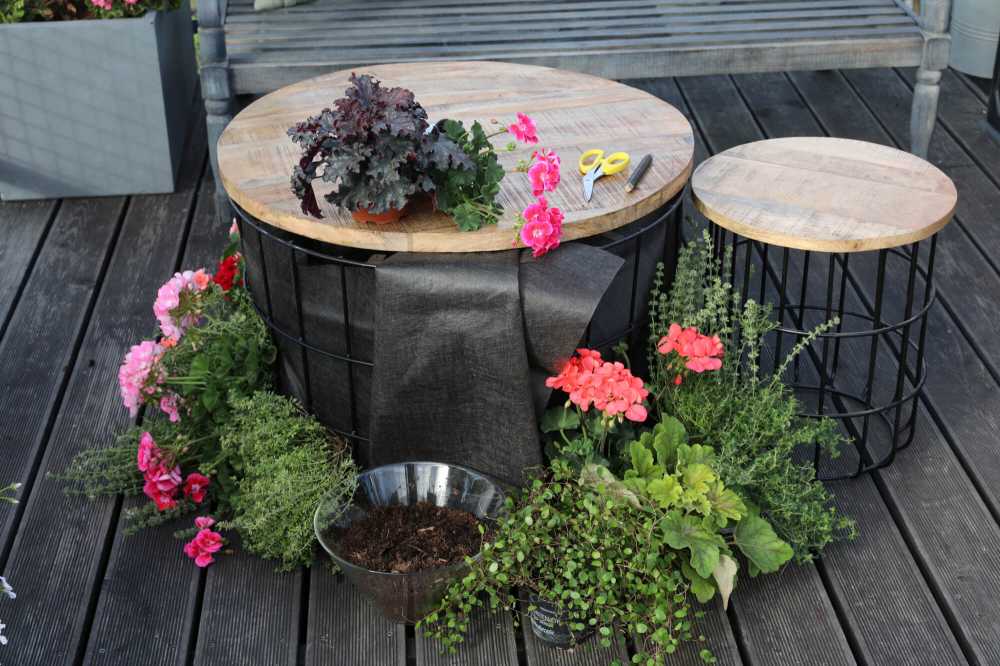 Und so wird’s gemacht: Die Tischplatte abnehmen und den Drahtkorb mit Hilfe von Aludraht vollständig mit Gartenvlies auskleiden. Anschließend zunächst den unteren Bereich des Korbs mit Blumenerde befüllen. Bei sehr großen Körben kann man Blumenerde einsparen, indem man in der Mitte des Korbs einen festen Gegenstand wie zum Beispiel einen Holzklotz platziert. Tipp: Reichert man die Erde von vornherein mit Langzeitdünger an, erspart man sich später das regelmäßige Düngen.