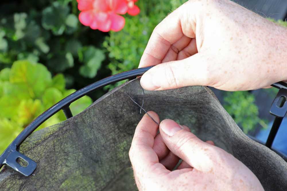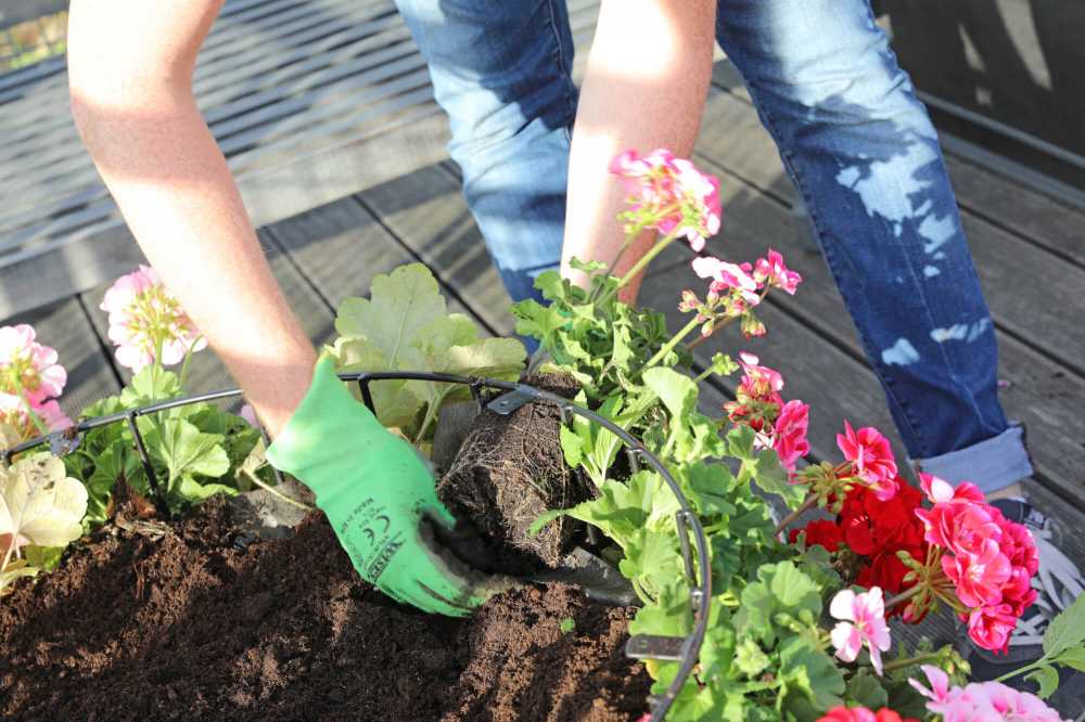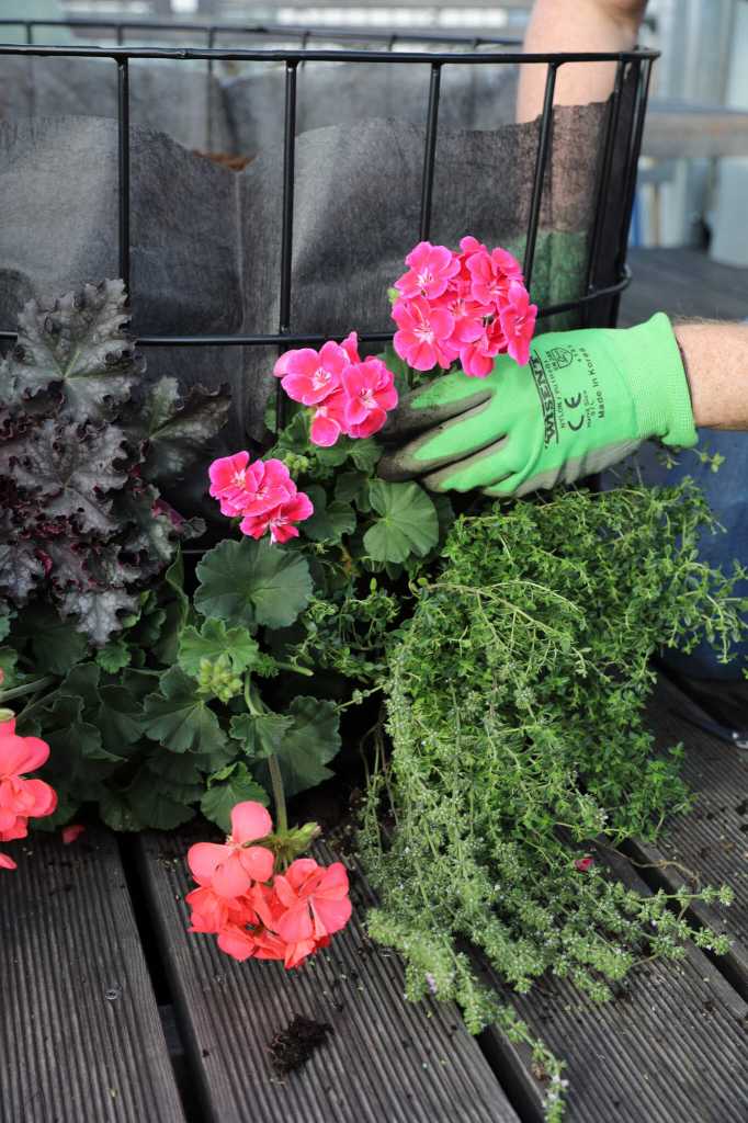 Schritt 3: Nun den Drahtkorb von außen bepflanzen. Dabei von unten beginnen und schrittweise Erde auffüllen, bis der Korb in seiner gesamten Höhe bepflanzt ist. Leichtes Schütteln befreit die Wurzelballen von überschüssiger Erde und macht sie schmaler, so dass sie leichter durch die Vlieslöcher passen. Tipp: Geranien gedeihen besonders gut, wenn sie ausreichend Platz haben. Der Abstand zur Nachbarpflanze sollte wenigstens 20 Zentimeter betragen.