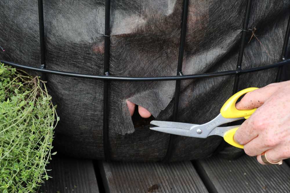 Schritt 2: Mit der Schere in die Mitte der Drahtöffnungen Löcher zur Bepflanzung in das Vlies schneiden und diese mit den Fingern behutsam so weit verbreitern, dass die Wurzelballen der Pflanzen hindurchgesteckt werden können.