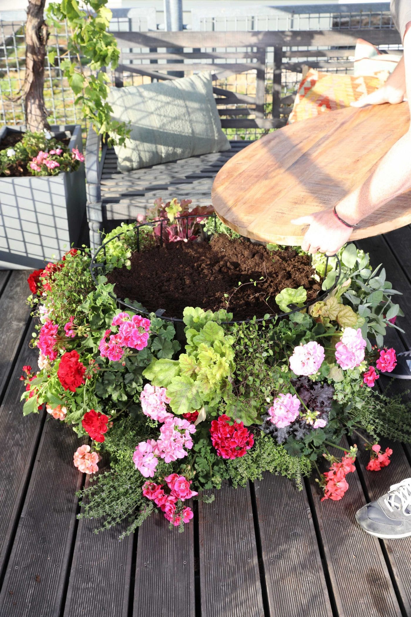 Schritt 4: Zum Schluss noch die Tischplatte wieder oben auf den Korb legen. Fertig ist der blühende Sommergartentisch! Zum Gießen einfach die Tischplatte abnehmen und von oben bewässern.