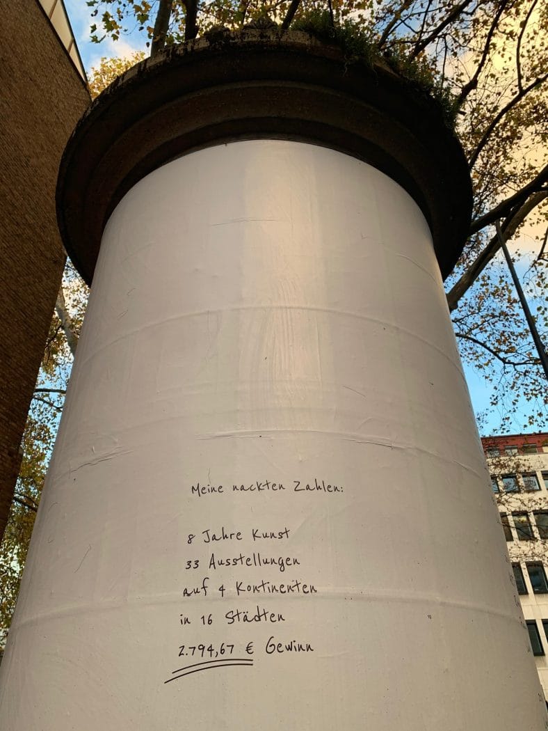 Die erfolgreiche Kunstaktion „Kunst an Kölner Litfaßsäulen“ wird mit einem neuen, ungewöhnlichen und hoch aktuellen Motiv weitergeführt. Dawid Liftinger ist der Künstler, der seine Einkünfte, sein finanzielles Dasein, offenlegt und diese Zahlen auf den 25 Litfaßsäulen den Betrachterinnen und Betrachtern zugänglich macht.
