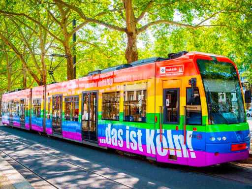 Die Kölner Verkehrs-Betriebe AG (KVB) hat anlässlich des bevorstehenden CSD und der Erinnerung an den Stonewall-Aufstand in der New Yorker Christopher Street vor 50 Jahren gemeinsam mit der Stadt Köln eine „Vielfalt-Bahn“ in den Farben der Regenbogenflagge gestaltet. Die Niederflur-Bahn, die für Köln unter anderem mit den Attributen „weltoffen“, „bunt “, „wertschätzend“ und „respektvoll“ wirbt, wird zunächst zwei Jahre lang auf den Linien 1, 7, 9, 12 und 15 unterwegs sein. Stellvertretend für Oberbürgermeisterin Henriette Reker stellten Bürgermeisterin Elfi Scho-Antwerpes und KVB-Vorstandsvorsitzende Stefanie Haaks die Bahn am Mittwoch der Öffentlichkeit vor.