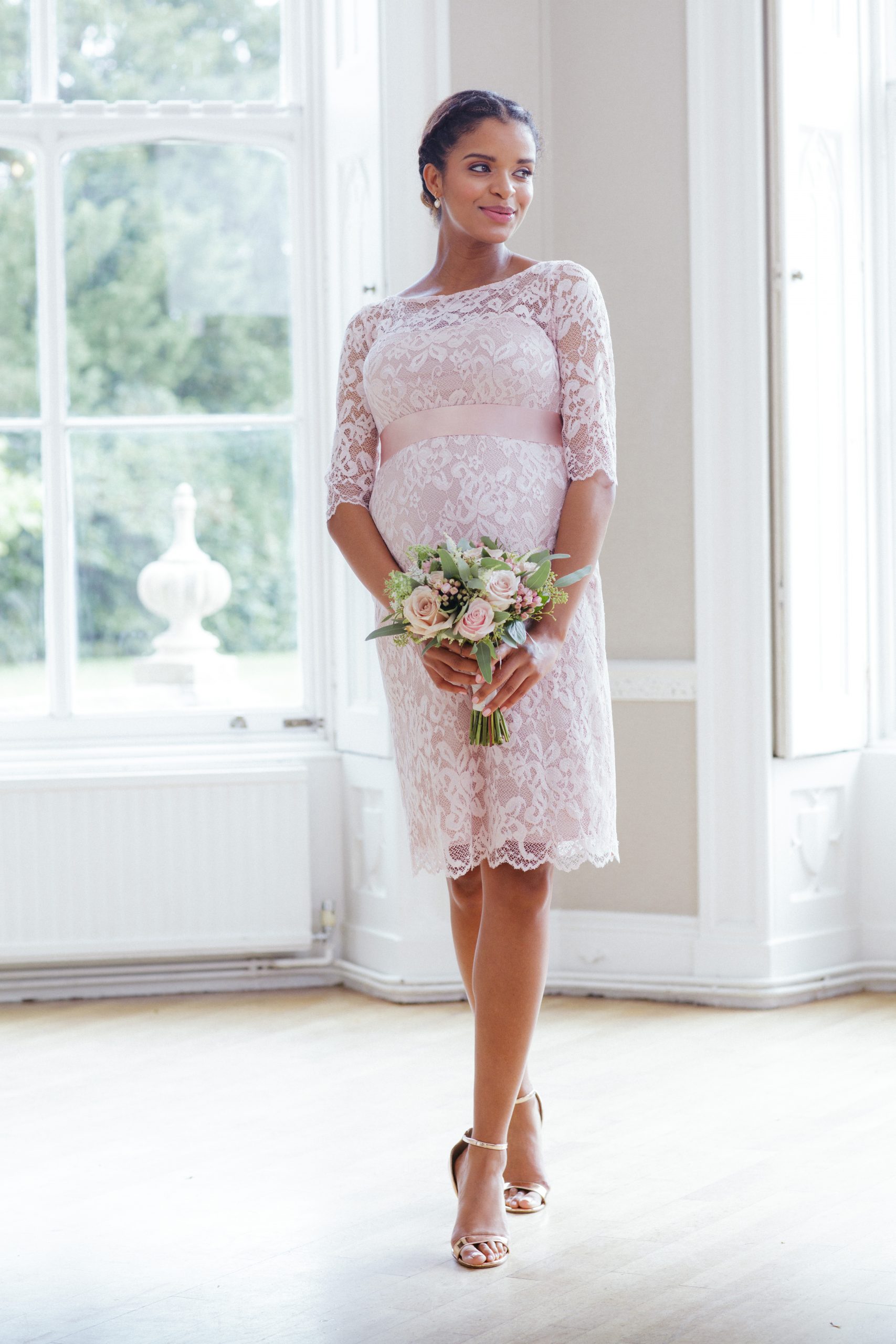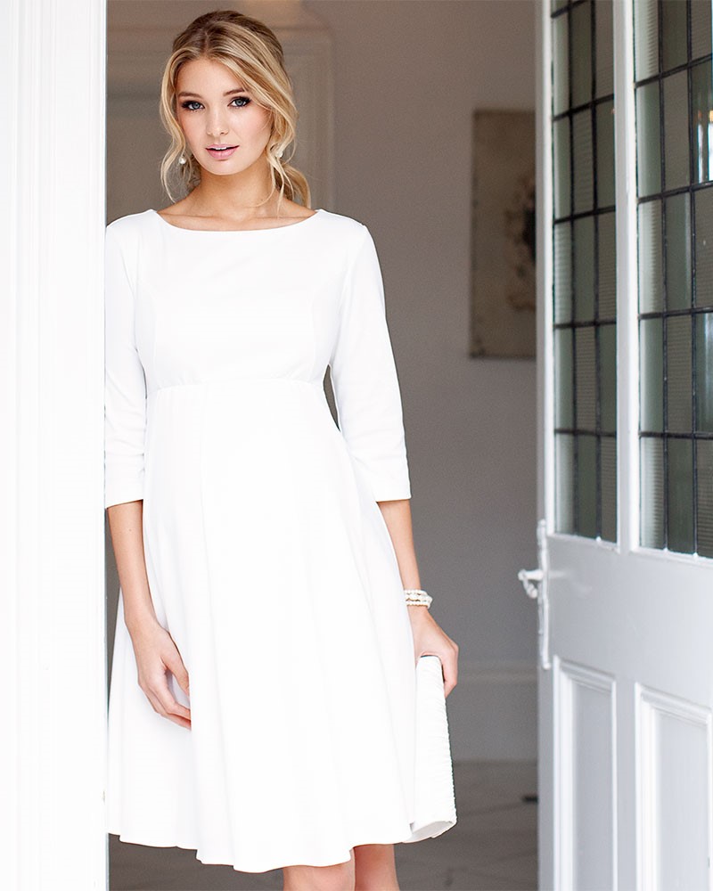 Maxikleider oder Kleider mit sanften Drapierungen ermöglichen Bewegungsfreiheit und lassen viele Babybäuche glatter wirken. Wenn Sie mehr Struktur bevorzugen (vielleicht für die Zeremonie), entscheiden Sie sich vielleicht für einen besser sitzenden Oberteil oder ein Mieder, das Halt gibt und dann fließend nach unten fällt.