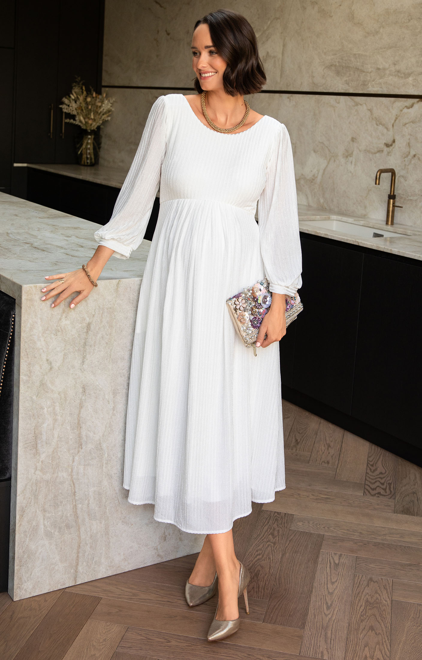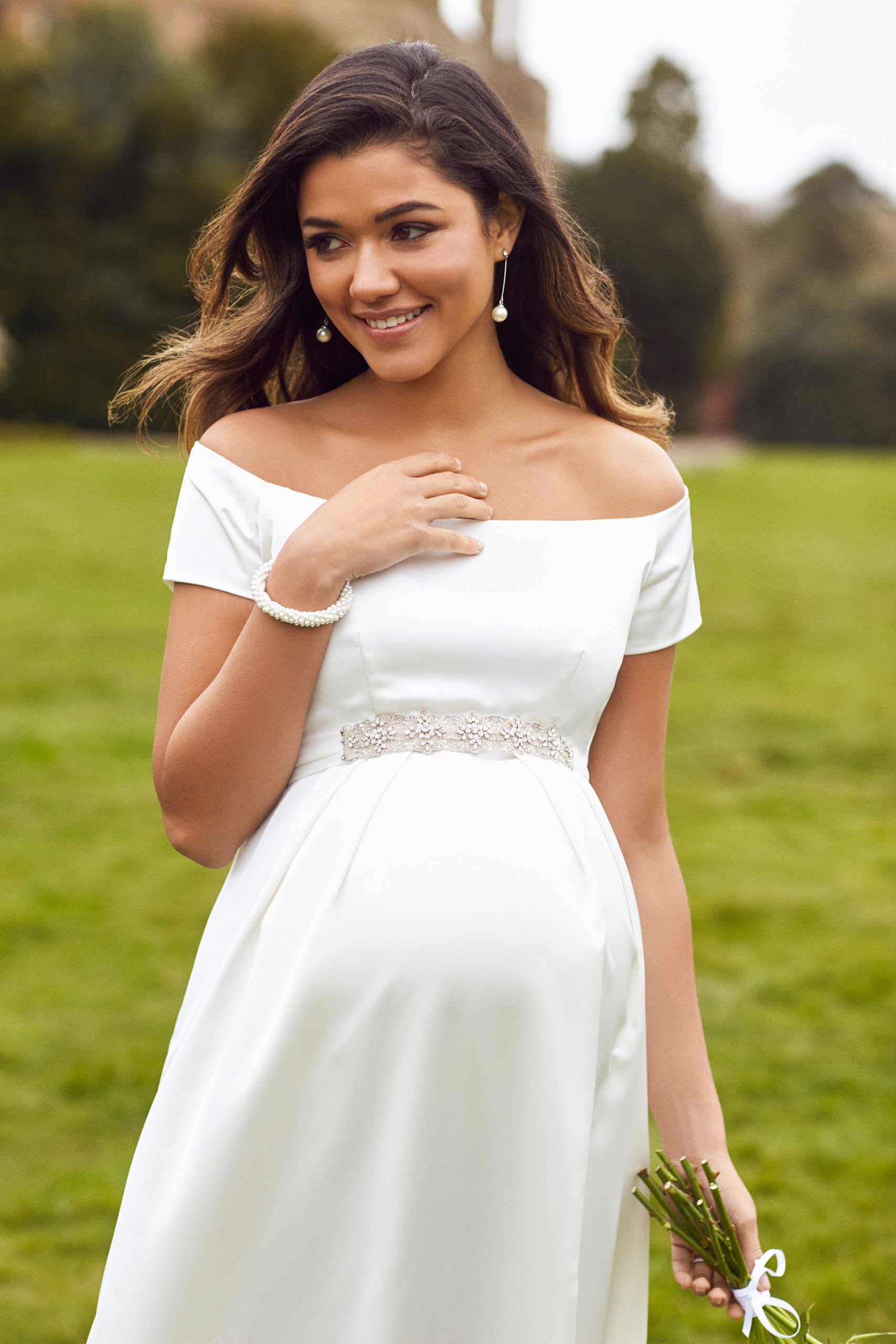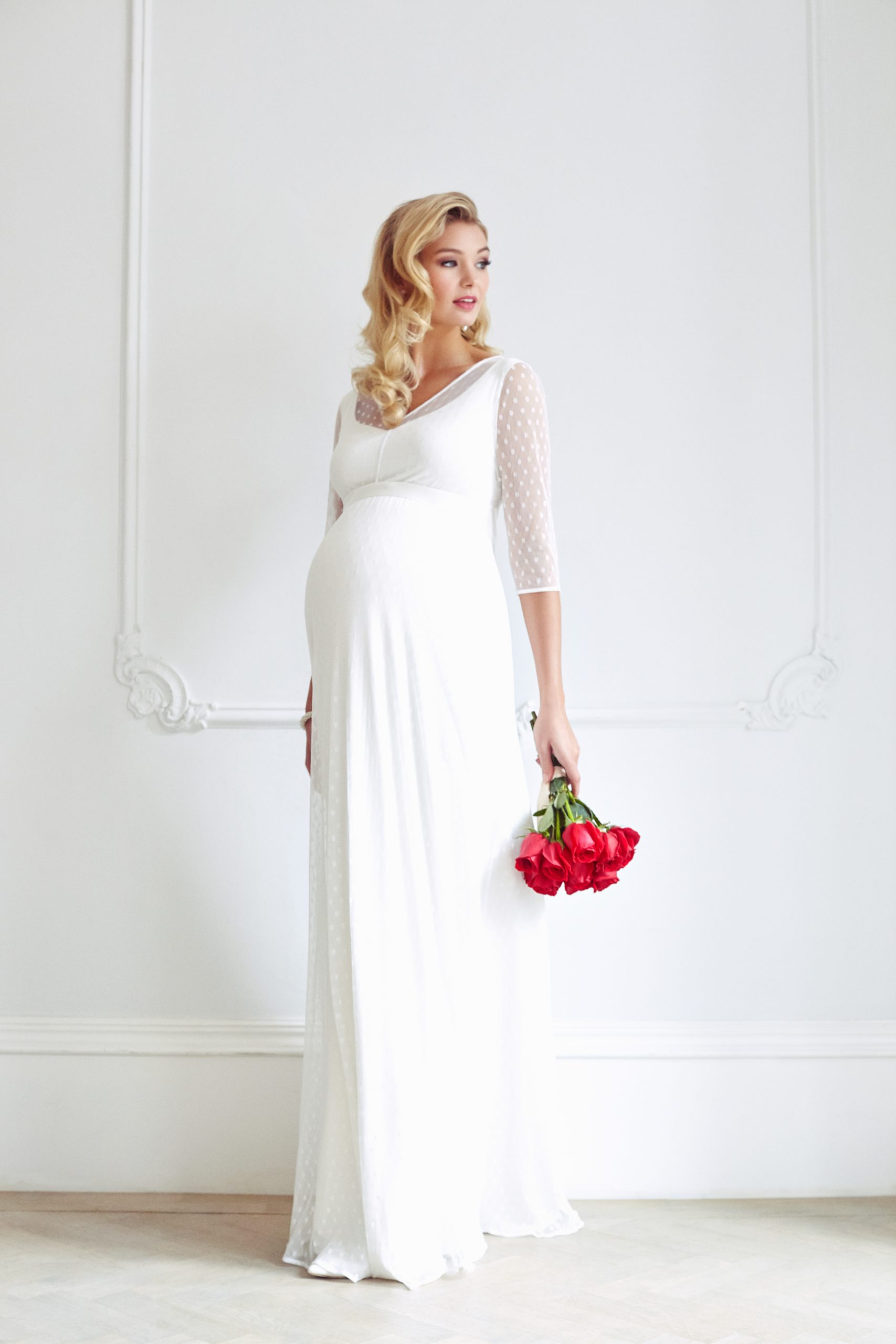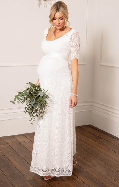 Unser Umstandshochzeitskleid Alaska in Elfenbein kombiniert ein wunderschönes Sweetheart-Spitzenoberteil mit einem weichen U-Ausschnitt und ellenbogenlangen Ärmeln. Der luxuriöse Rock aus 100% Seidenchiffon schwebt mühelos zu Boden und kreiert eine wunderschöne Silhouette. Speziell entworfen, um sich Ihren wachsenden Kurven anzupassen und zu schmeicheln. Sie werden sich darin an Ihrem besonderen Tag einfach umwerfend fühlen.