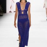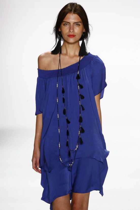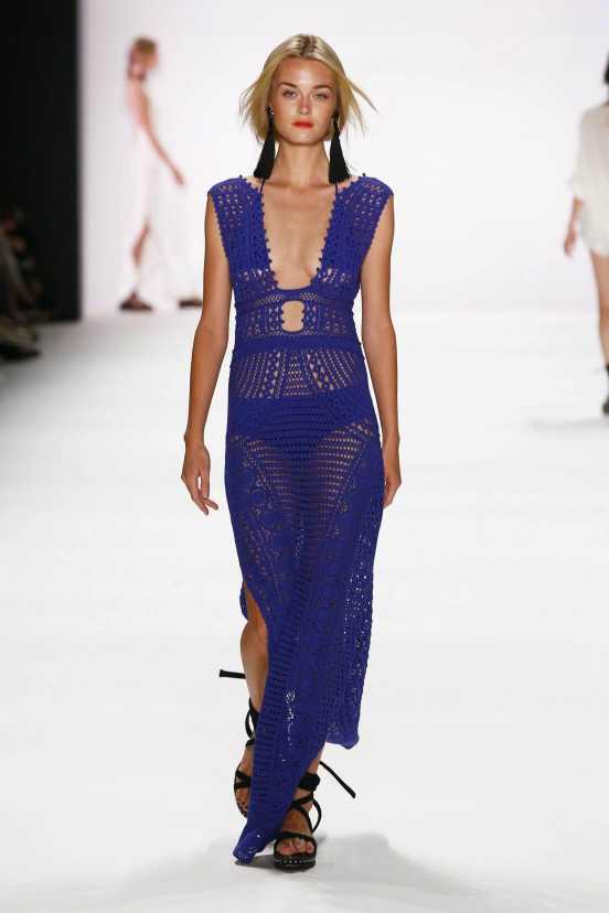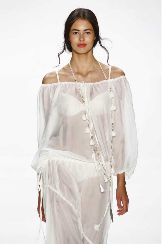 Sexy Höhepunkt ist ein bodenlanges Modell aus royalblauem Tüll, aufwändig bestickt mit Ornamenten, die abgeleitet sind von mexikanischer Folklore, darunter der passende Bikini und viel Haut. Flache, geschnürte Espadrilles runden das Styling ab. Aufwändige Chandeliers mit Perlen und Quasten bringen einen Hauch Glamour. Den Look unterstützt weich fallendes, leicht zusammengebundenes Haar und sehr natürliches, sonniges Make-Up mit schwarzen Wimpern und Lippen in Koralle – pur und modern.