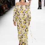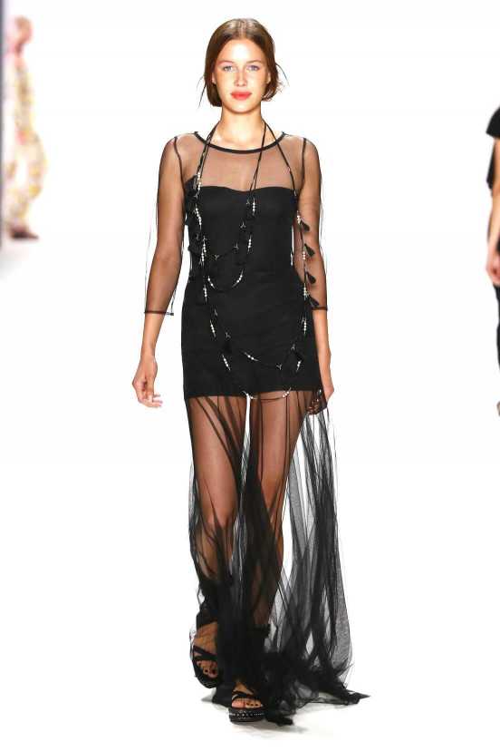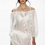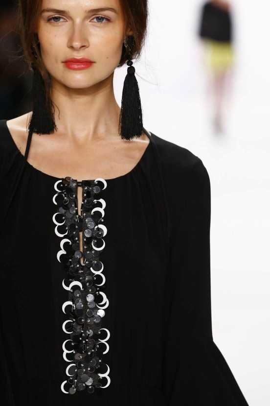Beim „Neo Flamenco“ trifft die Carmen-Bluse auf weite Herrenhosen, Kickflares oder Jeans mit Fransendetails, sie machen den Look lässig. Neue Cropped Joggingpants kommen mit einer Raffung und einem kleinen Schlitz, der die Sicht auf das Bein freigibt. Highlights sind ein Mini-Korsagen-Kleid, das unter einem bodenlangen Rock aus Puder-farbenem Tüll mit aufgestickten Blüten hervorblitzt, dasselbe kommt auch in geheimnisvollem Schwarz. Außerdem ein bodenlanges Seidenkleid bedruckt mit einem Batik-Kaleidoskop-Muster in Gelb, Weiß, Schwarz mit asymmetrischen Raffungen und Carmen-Ausschnitt. Ein bodenlanges, gestreiftes Strickkleid in Navy-Ecru mit kleinem Rollkragen bildet einen Kontrast zu den femininen Formen.