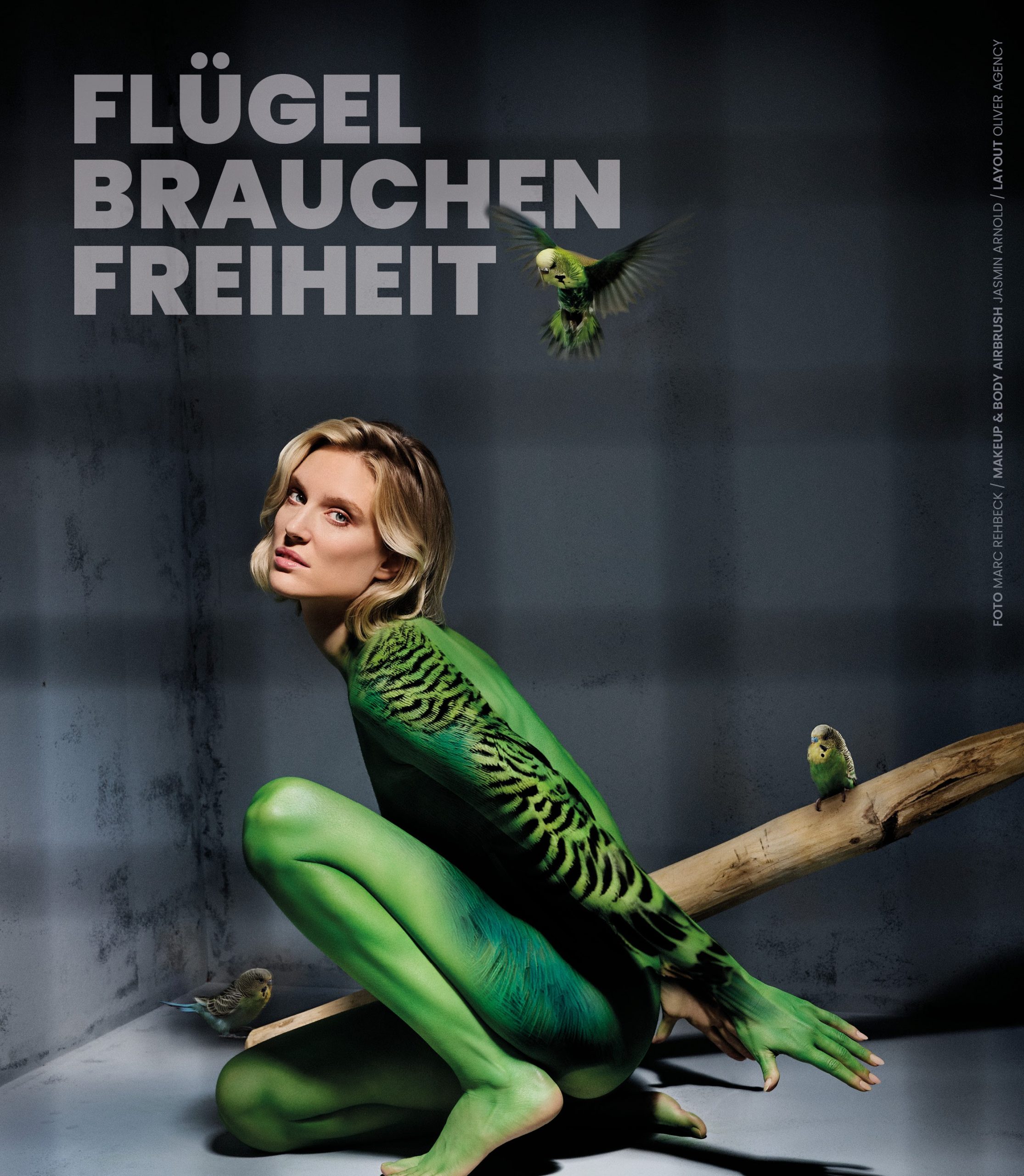 Bildschön, verletzlich und eingesperrt: Kim Hnizdo verwandelt sich für ein neues PETA-Motiv in einen Wellensittich und protestiert damit eindrucksvoll gegen die Haltung von Vögeln in Käfigen. Die ehemalige „Germany’s Next Topmodel“-Gewinnerin präsentiert sich mit einem aufwendigen Bodypainting, kauert dafür in trister Umgebung ohne Freiheit. Seit Jahrhunderten sind Menschen fasziniert vom Anblick und der Anmut fliegender Vögel und von ihrem Gesang. Doch leider entscheiden sich noch immer viele dazu, Vögel als sogenannte Haustiere