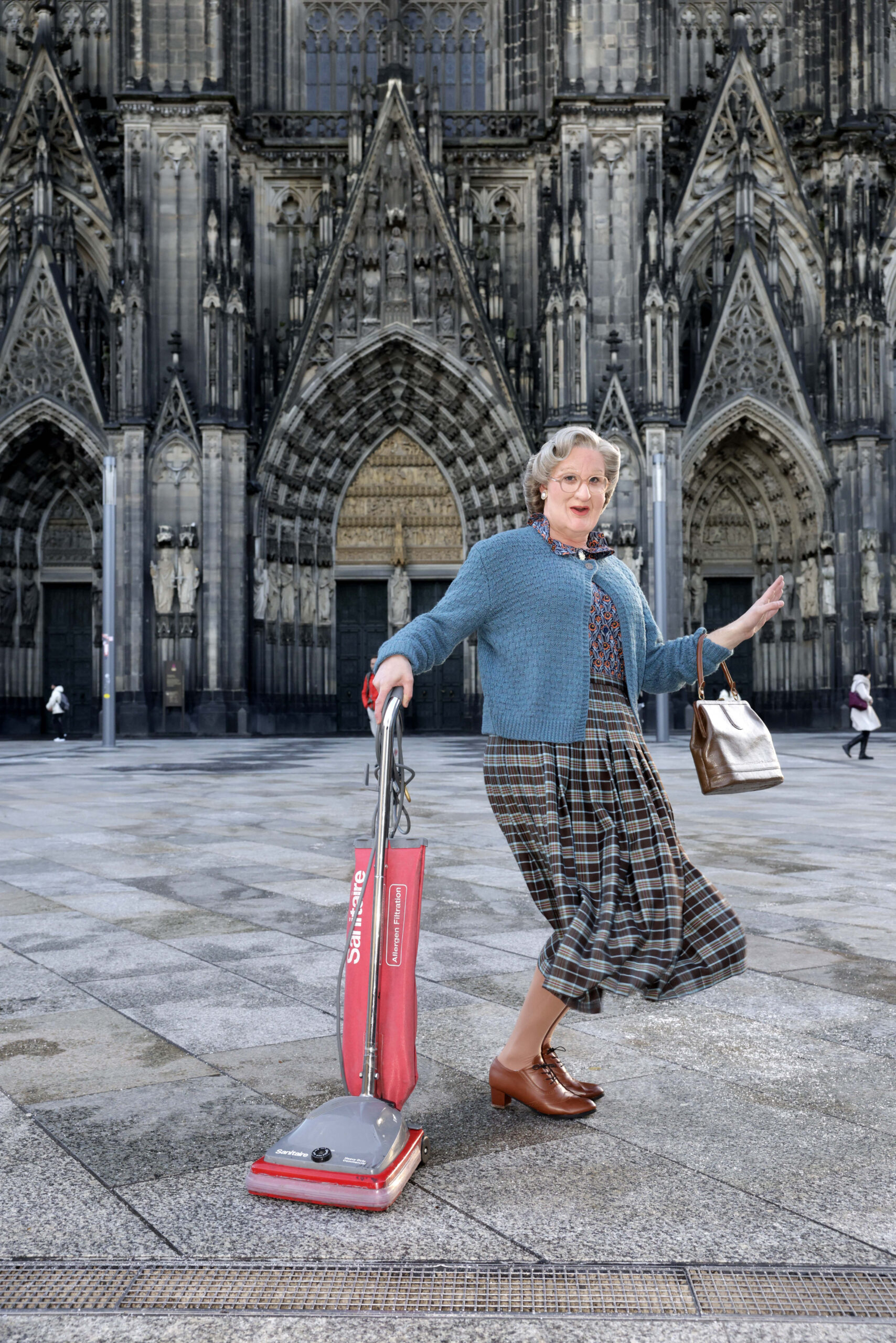 Kerzengerade im karierten Rock, die legendäre braune Handtasche locker am Handgelenk baumelnd, stand Mrs. Euphegenia Doubtfire am 02. Januar in aller Herrgottsfrühe vor dem Kölner Dom – quasi im Herzen der Stadt!
