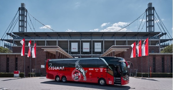 Der 1. FC Köln hat einen neuen Mannschaftsbus. Ab dem Spiel gegen RB Leipzig wird das Team von Cheftrainer Markus Gisdol in dem komfortablen Bus von SETRA zu den Partien reisen. Das Design ist in knallrot gehalten, auf den Seiten prangt das FC-Logo, vom Heck schaut Hennes IX. auf den nachfolgenden Verkehr herunter. Dazu sind die Social-Media-Kanäle des Clubs aufgelistet, verbunden mit der Aufforderung: „Folge dem #effzeh!“