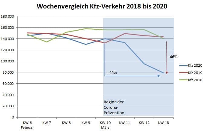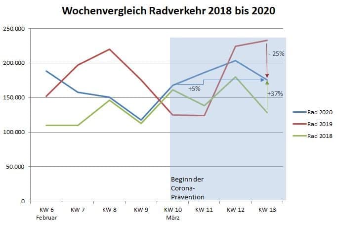 Vor dem Hintergrund der Corona-Epidemie ergeben sich in Bezug auf das Verkehrsaufkommen der Verkehrsmittel Auto und Fahrrad interessante Erkenntnisse. Bedingt durch vermehrte Home-Office-Arbeit sowie geschlossene Geschäfte und öffentliche Einrichtungen zeigt sich insgesamt ein Rückgang an Verkehrsbewegungen.