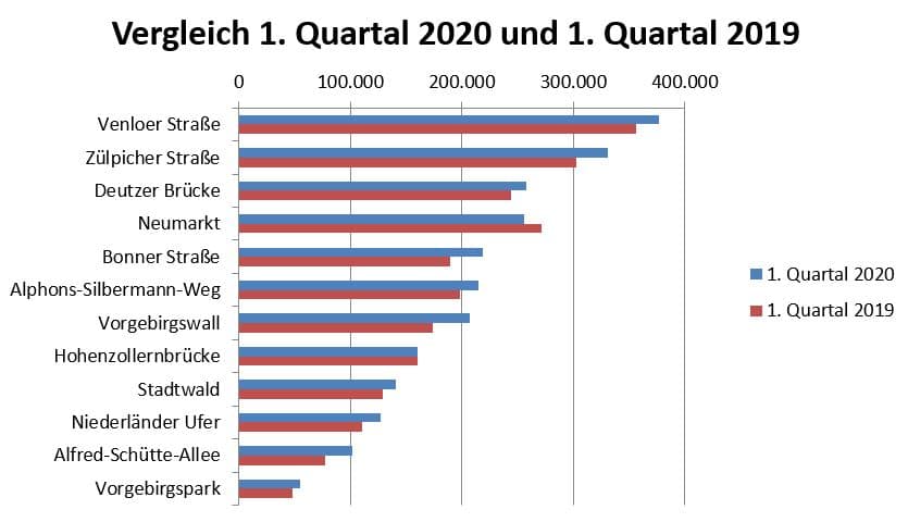 Das erste Wochenende im April bestätigt die Verkehrsentwicklung des 1. Quartals 2020 mit einer Zunahme in Höhe von 12 Prozent gegenüber dem Vorjahr. Wegen des besonders guten Wetters und mutmaßlich wegen der Beschränkungen durch die Corona-Epidemie waren am Wochenende besonders viele Radfahrende auf den Radwegen im Grünen unterwegs. An der Dauerzählstelle Vorgebirgspark wurde am 5. April 2020 ein neuer Spitzentag mit 1696 Rädern gemessen. Insbesondere die Dauerzählstellen Alfred-Schütte-Allee, Vorgebirgspark, Vorgebirgswall, Niederländer Ufer und Stadtwald verzeichneten im Vergleich zum ersten Aprilwochenende 2019 massive Zunahmen. Als Beispiel zu nennen ist die Alfred-Schütte-Allee, auf der am 5. April 5.058 Radfahrende und damit 242 Prozent mehr als am Vorjahressonntag unterwegs waren.