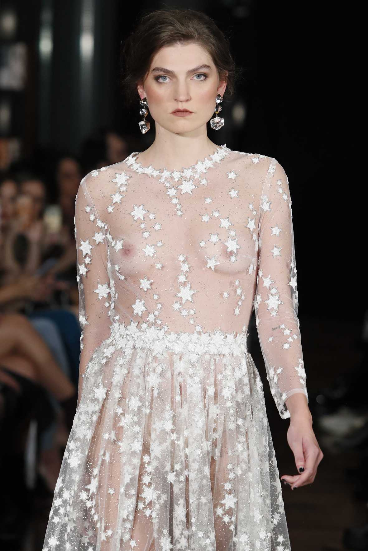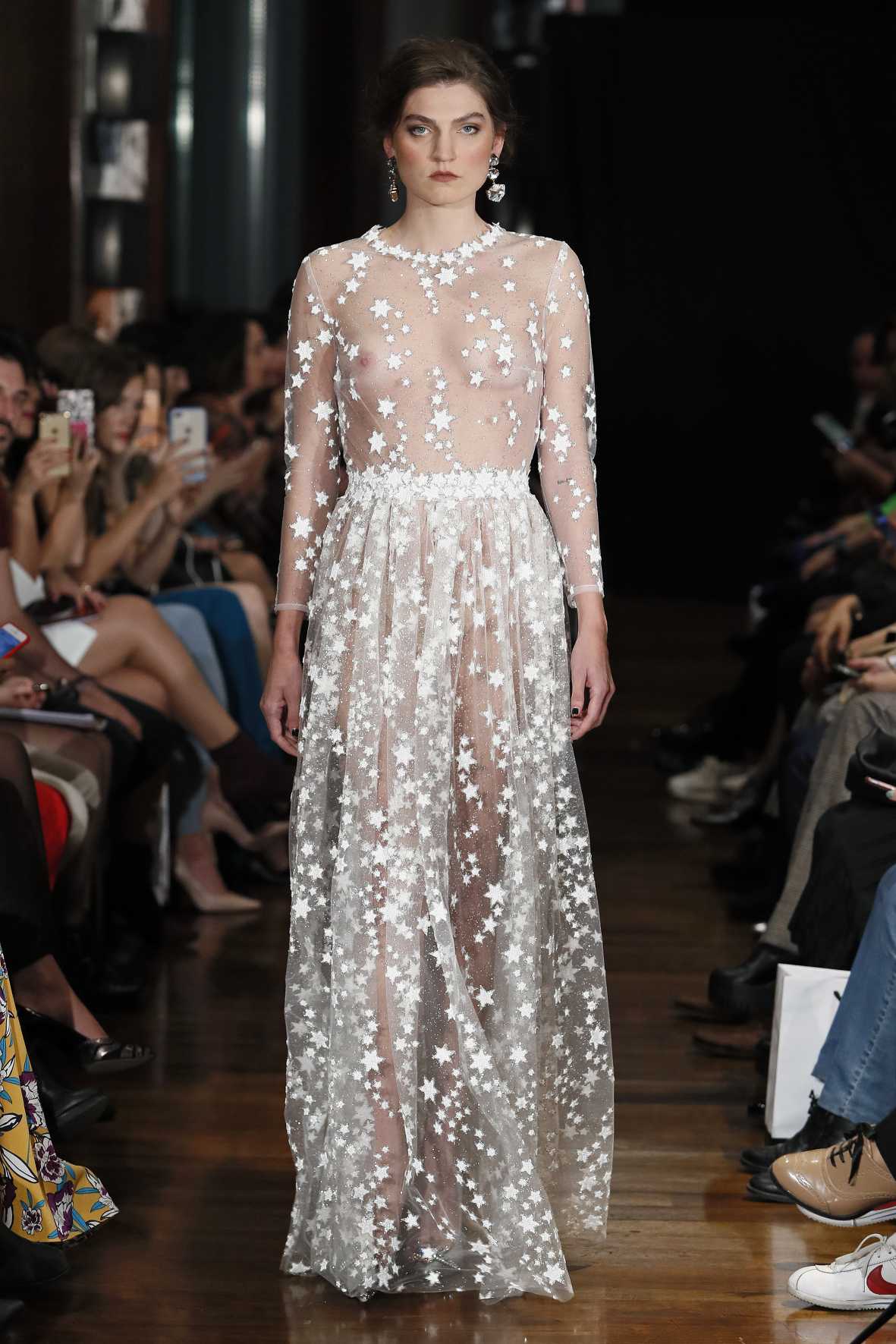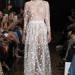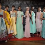 Chic sind neutrale Farben wie Schwarz und Weiß, Nude Pink, Himmelblau und Schwarz auf Stoffen wie Crepe, Plumetti Tüll, gestickten Blumen und Strasssteinen, Motiven in Schwarz und Weiß auf Silberbrokat, Kombinationen aus Dupionseide in Herbst-Winter-orientierter Himmelblau und Kastanienbraun und andererseits auffällige Farben wie lustige Gelb- und SANGER-Champagnergold, Schattierungen von Himmelblau, Silbergrau, Mintgrün und Hellrosa und verziert mit Mintgrün und Malvenfarben Pailletten. Dupionseide, Plumetti Tüll, Strick, Krepp, Organza und Spitze für die Frühjahr-Sommer-Saison.
