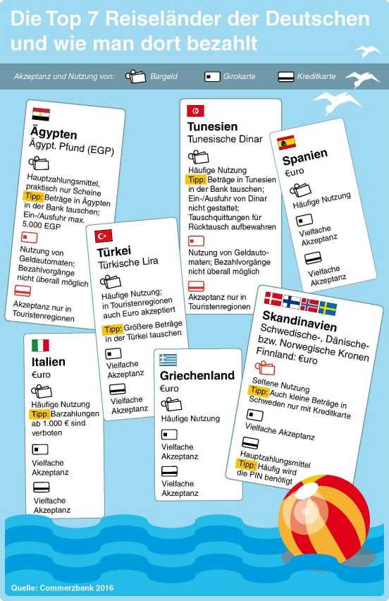 Während in Ägypten Bargeld an erster Stelle steht, kommt man in Skandinavien ohne Kreditkarte nicht weit: Wer jetzt in den Sommerurlaub startet, sollte auch an die richtige Reisekasse denken. Die besten Tipps hat die Commerzbank zusammengestellt: