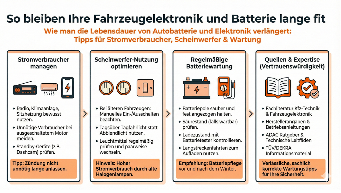 Schalten Sie elektrische Verbraucher wie Radio, Klimaanlage oder Sitzheizung erst ein, wenn der Motor läuft. Bei stehendem Motor zapfen diese Geräte direkt die Batterie an. Vergessene Scheinwerfer oder ein eingeschaltetes Radio können die Batterie innerhalb weniger Stunden entladen.