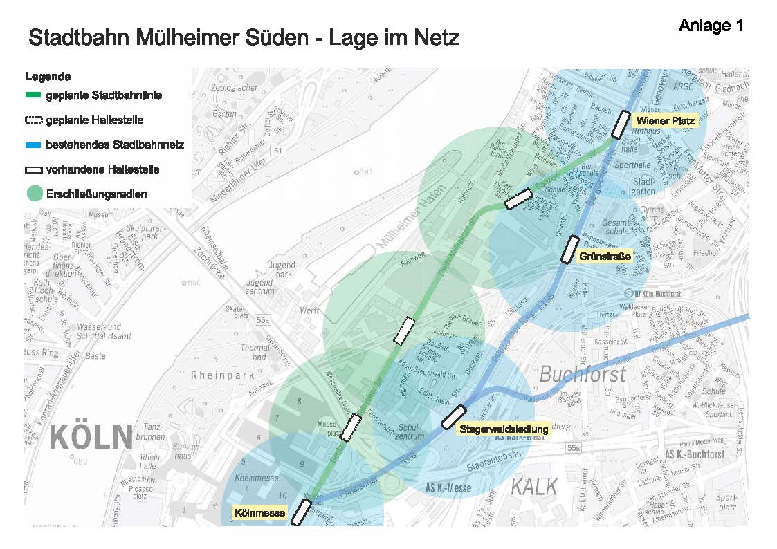 Die Verwaltung hat in diesem Zusammenhang eine Vorlage für einen Bedarfsfeststellungsbeschluss zur Stadtbahnanbindung des Mülheimer Südens in den Gremienlauf gebracht. Die Kosten für die Planungsleistungen sowie die erforderlichen Gutachter- und Dienstleistungen zur Realisierung der Stadtbahnanbindung werden auf rund 2,4 Millionen Euro geschätzt. Mit dem Bau der Stadtbahnanbindung wird der gesamte Straßenraum überplant. Die Verwaltung wird zudem beauftragt, mit den hierfür erforderlichen Leistungen stufenweise externe Fachbüros zu beauftragen. Der Rat der Stadt Köln als Beschlussorgan könnte die Vorlage nach Beratung im Finanz- und Verkehrsausschuss sowie den Bezirksvertretungen 1 (Innenstadt/Deutz) und 9 (Mülheim) in seiner Sitzung am 24. Juni 2021 beschließen.