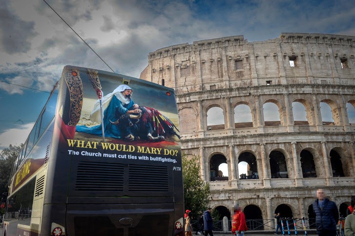 Tierquälerei als Unterhaltung: Pünktlich zum katholischen Feiertag Mariä Empfängnis am 8. Dezember ist in ganz Rom eine provokante Botschaft erschienen. Es ist ein Bild der Jungfrau Maria, die einen Stier vor einem Matador schützt. Zusammen mit einem Aufruf an die katholische Kirche, sich von der gewalttätigen Praxis des Stierkampfes zu trennen, ist das Motiv auf zwei Bussen zu sehen. Sie fahren durch das Zentrum Roms und kommen an allen wichtigen Sehenswürdigkeiten vorbei. Der Appell ist Teil einer PETA UK-Kampagne, in der Papst Franziskus aufgefordert wird, die Folter von Stieren bei Stierkämpfen endlich zu verurteilen.