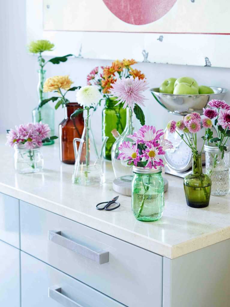 Verschiedenste Chrysanthemen werden von ihrem Blattwerk weitestgehend befreit und jede für sich in ebenso unterschiedlichen Glasgefäßen platziert. Dabei werden die Blüten und Vasen möglichst gegensätzlich gewählt. So ergeben kleine, kompakte Chrysanthemenblüten in sanftem Pastellrosa und Cremeweiß einen interessanten Kontrast zu Einweckgläsern und dunklen Glasvasen, während große, ausgefranste oder spinnenartige Blüten auf zarten Fläschchen mit schmalem Hals thronen. Als kompakte Komposition auf Tischen oder als florale Dekorationslandschaft auf einer Anrichte präsentiert, zieht so mit wenigen Handgriffen der Sommer in das Zuhause ein.
