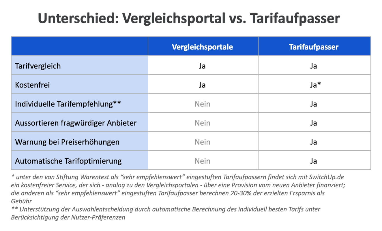 3. Automatische Optimierung mittels Tarifaufpasser: In den letzten Jahren findet die neue Lösung der sogenannten Tarifaufpasser großen Anklang. Diese richten sich vor allem an Verbraucher, die keine Lust haben, jedes Jahr ihren Stromtarif selber zu überprüfen. Im Gegensatz zu klassischen Vergleichsportalen behalten Tarifaufpasser die Strom- und Gastarife ihrer Nutzer kontinuierlich im Blick und optimieren diese vollautomatisch, sobald sich ein besseres Angebot findet. Ebenso achten sie auf Preiserhöhungen und wehren diese automatisch ab. Stiftung Warentest hat diese neue Gattung der Tarifaufpasser einem Langzeittest unterzogen und kam zu einem klaren Ergebnis: „Das ist bequem und lohnt sich.“
