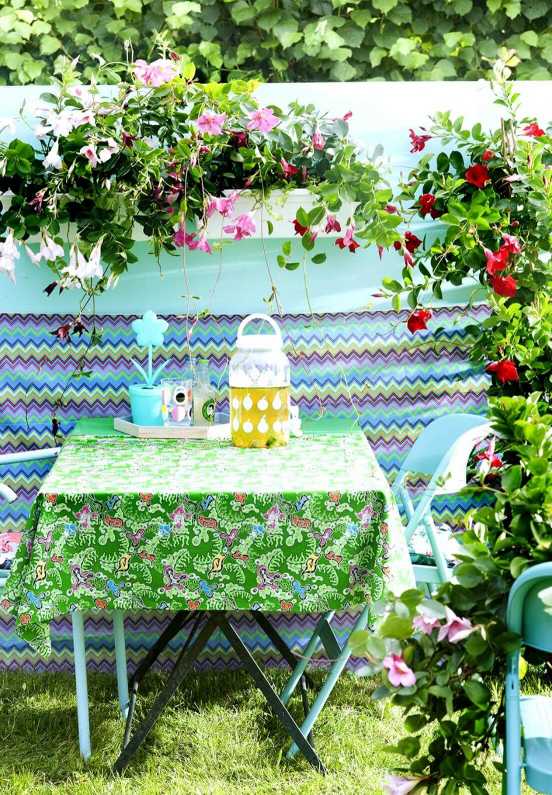 Eigentlich als Zimmerpflanze bekannt, erobert die Mandevilla mit ihren roten, pinken oder weißen Blüten im Sommer auch Balkone und Terrassen. Die Blütenfülle der imposanten Kletterpflanze kommt besonders in Hängekästen perfekt zur Geltung und bringt Auflockerung und Leichtigkeit in den Garten. Für ein gelungenes Picknick in der Garten-Oase setzen bunte Teller, Stühle und Textilien mit verschiedenen Mustern und Stoffen die richtigen Akzente und vollenden das poppige Zusammenspiel mit auffälligen Blüten.