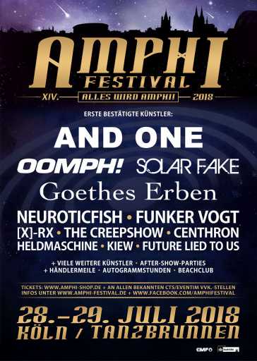 Zum 14. Mal wird das Amphi Festival am 28. & 29. Juli 2018 seine Pforten für über 12.000 Besucher aus aller Welt öffnen. Im Kölner Tanzbrunnen und auf der MS RheinEnergie erwarten die Besucher im kommenden Jahr wieder über 40 der besten Szene-Acts. Der Spatz rief es zuerst vom Dach, dann – zum Erstaunen der Veranstalter selbst – folgte der Künstler selbst mit seinem Ruf von der Bühne: AND ONE werden zurück nach Köln kehren und das Amphi Festival 2018 headlinen.