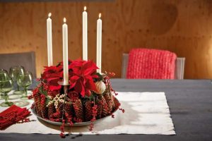 Wer prunkvolle Dekorationen mag oder für wen es zumindest in der Weihnachtszeit gerne ein bisschen mehr sein darf, schmückt sein Haus mit diesem Adventskranz. Er verbindet Elemente längst vergangener Zeiten mit einem modernen Gestaltungsanspruch. Die Hauptdarsteller: leuchtend rote Mini-Weihnachtssterne. Sie werden in eine dekorative Schale gepflanzt, die zusätzlich mit Zieräpfeln, Wacholder, Eukalyptus und Ilex sowie verschiedenfarbigen Kugeln und Sternen üppig geschmückt ist. Die Kerzen finden in mit Heißkleber fixiertem Steckschaum Halt. Sie wählt man am besten einen Farbton dunkler als die Weihnachtssterne. Bei unserer Kombination ist das ein sattes Granatapfelrot für einen märchenhaft-opulenten Weihnachtscountdown.